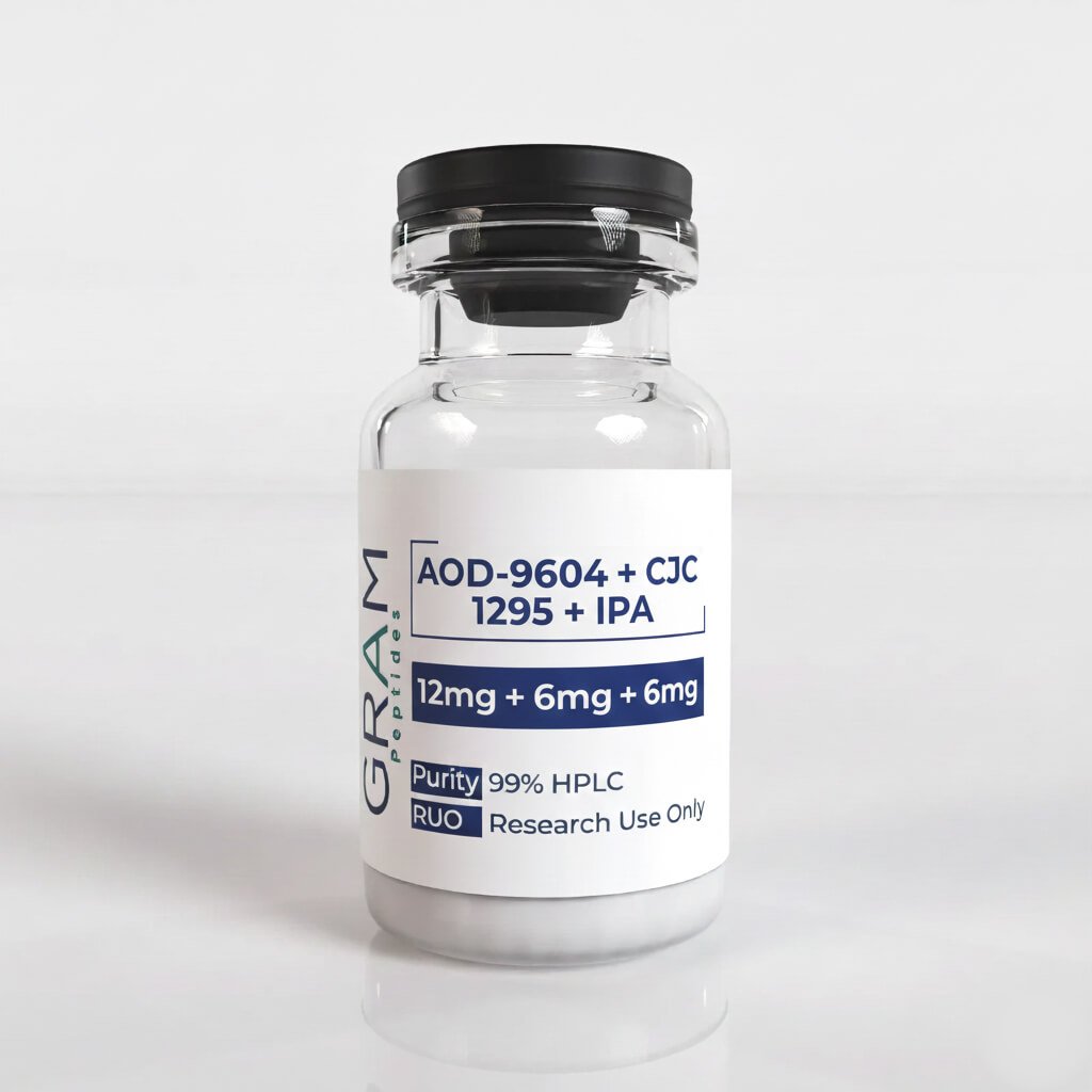 Each vial contains AOD-9604 12 mg + CJC-1295 6 mg + Ipamorelin 6 mg, lyophilized for stability.